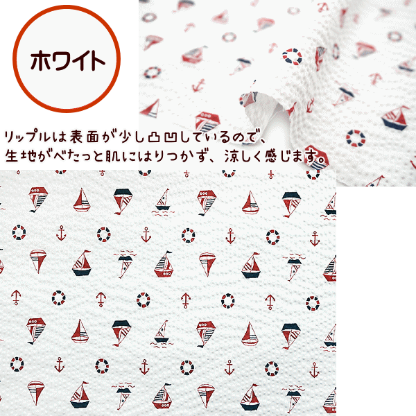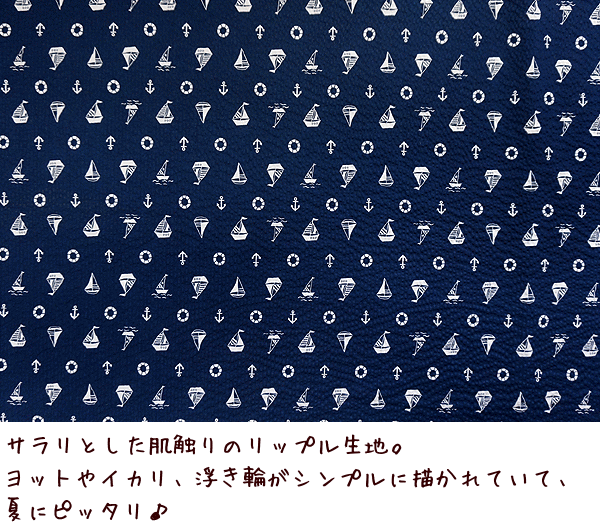 ■生地をご購入の前にお読みください リップル生地 ヨット イカリ 綿100% 布 リップル 生地 手芸 手作り ゆかた 浴衣 甚平 ヨット柄無くなり次第終了! リップル生地(ヨット・イカリ柄) ヨットやイカリが一面に描かれた、 サラリとした肌触りのリップル生地♪